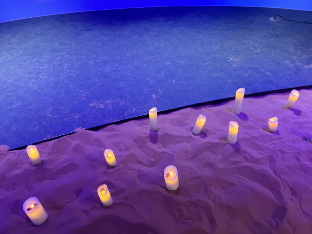 ヨルダンの自然や文化、未来へのメッセージが流れ、照明が砂の粒に反射してとても幻想的。