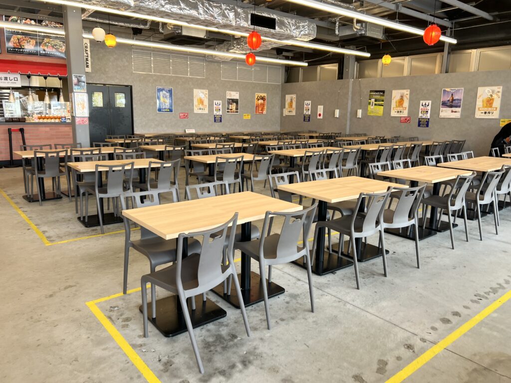 くら寿司近く、ミャクミャクくじを通り過ぎて奥に進むと現れる「西口フードコート」。 朝10時頃は席がガラガラで、空調も効いていて休憩に最適です。ベンチも多く、家族連れや小さなお子さん連れでも安心。