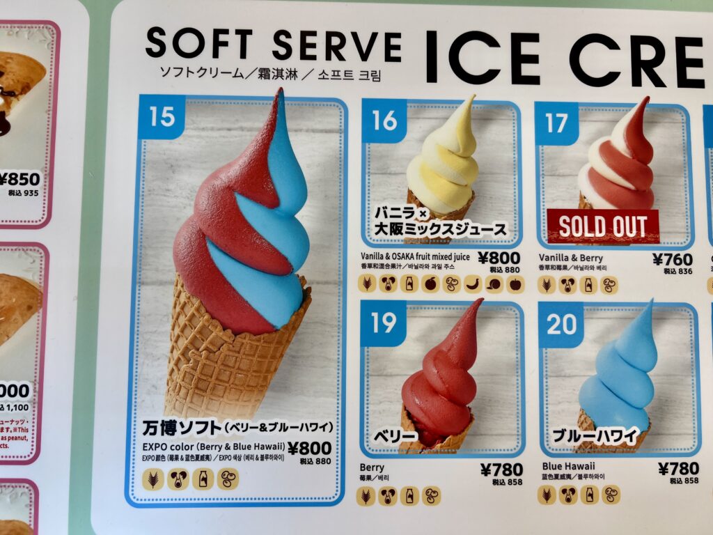 EXPOカラー(ベリー&ブルーハワイ)のソフトクリームはインパクト大! 赤と青のビジュアルが写真映えするので、SNS投稿にもおすすめです。